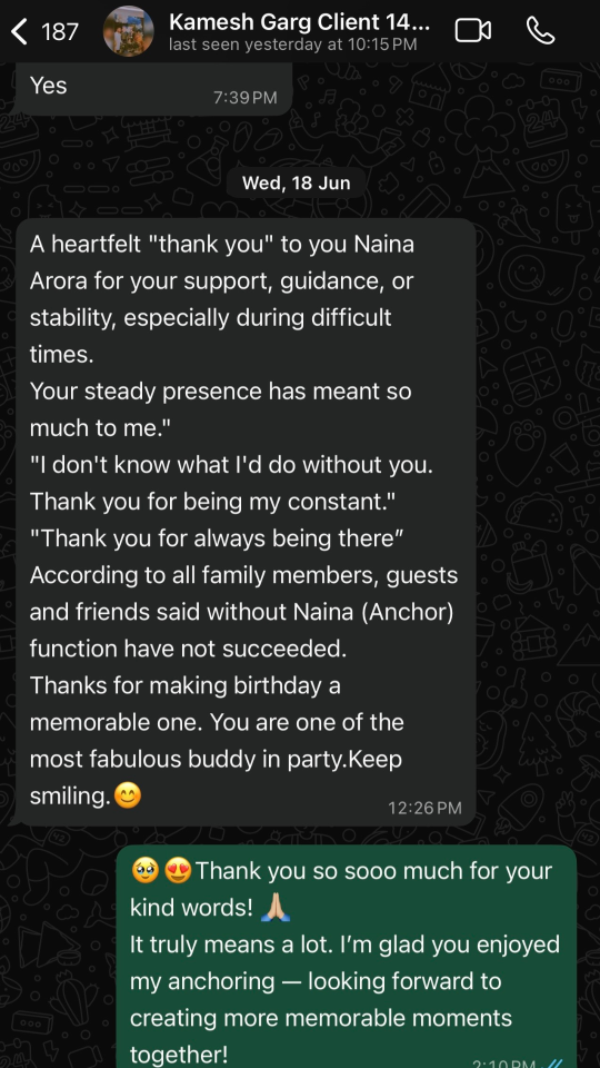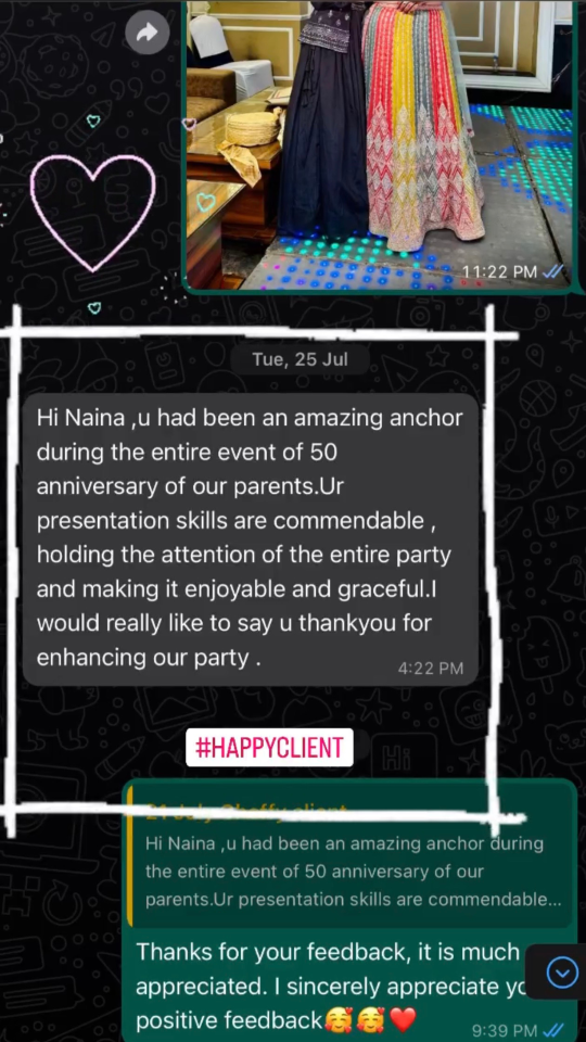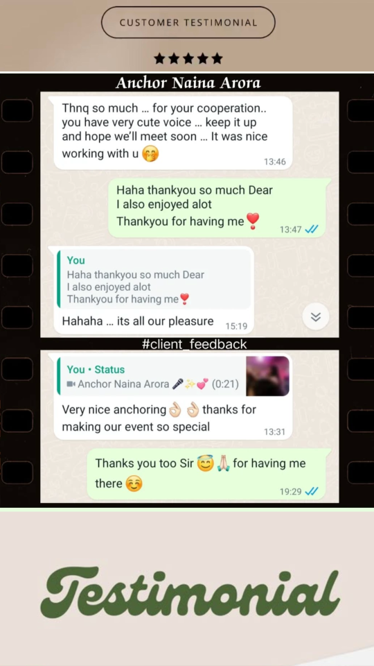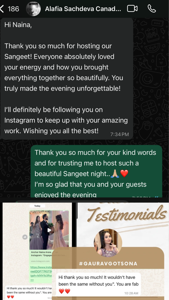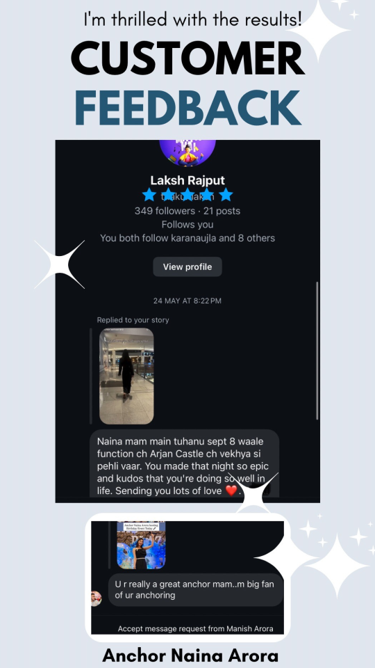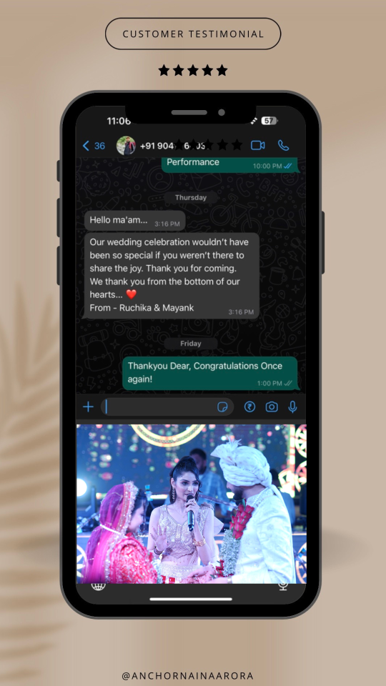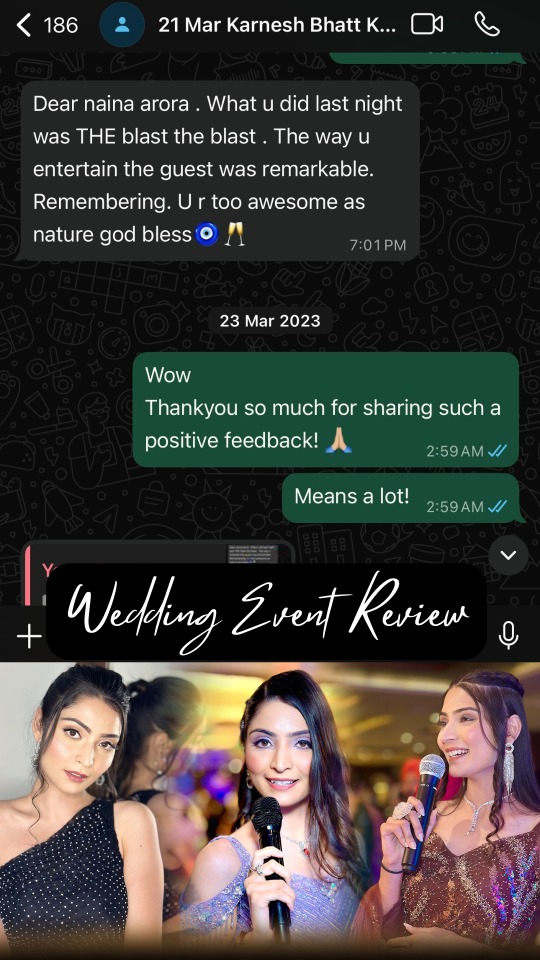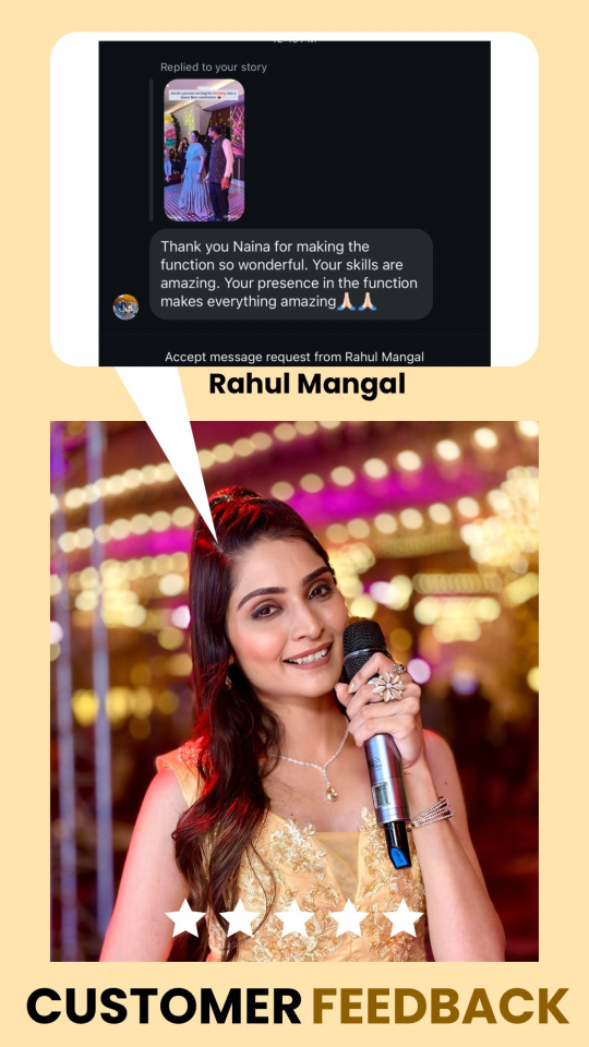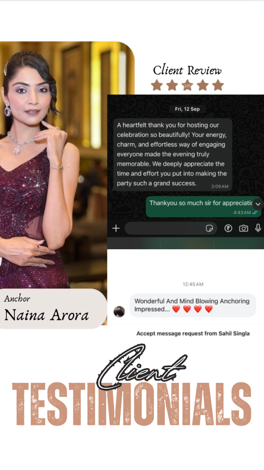 In just 4 years, Naina Arora has hosted 1000+ live shows - from grand weddings and celebrity events to corporate galas & global festivals - and nearly every event type you can imagine. Known for turning every event into a memory and every mic moment into magic.